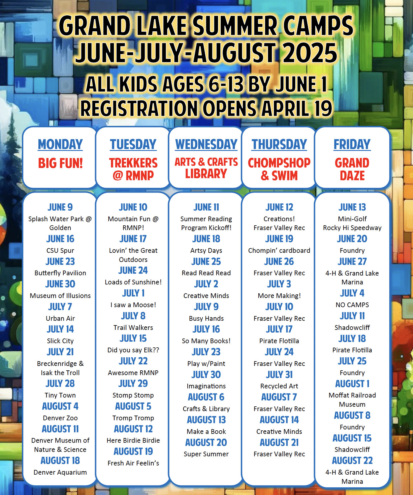 Grand Lake Summer Camps will run June 9 to August 22, Mondays through Fridays.